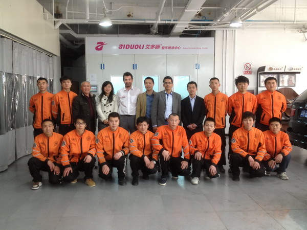 本司訊:2013年4月北京晴空萬里,龍神公司特邀英國專家一行五人,來到了北京車爵士進(jìn)行汽車噴涂遮蔽技術(shù)交流。首先公司一行了解車爵士的汽車噴涂情況及詢問了使用的遮蔽工具情況。隨后英國專家針對(duì)在汽車噴漆時(shí)難噴涂的車門縫隙、玻璃死角等地方的專業(yè)遮蔽工具的演示。車縫泡沫膠:用于車身所有縫隙的遮蔽,有效隔離及遮蔽漆霧噴入車縫里。