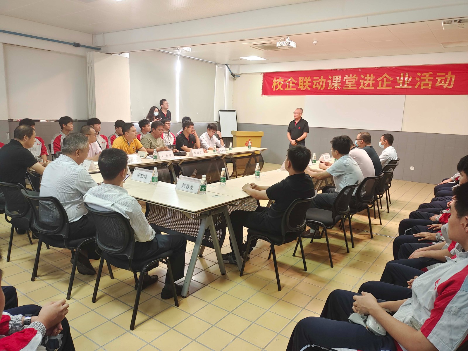 本次活動地點(diǎn)為珠海市龍神有限公司培訓(xùn)部,出席活動的領(lǐng)導(dǎo)和嘉賓有珠海市龍神有限公司彭小龍董事長、蘇佛足總經(jīng)理、我校梁柏健校長、劉春龍副校長、實(shí)訓(xùn)與對外交流處副主任余穎濤,以及龍神公司培訓(xùn)老師陳嘉深、張冬冬、黃偉聰,職教橋?qū)<尹S濤、詹曉婷,我校汽車專業(yè)部部長石也言、衛(wèi)紅軍老師、趙燦明老師、溫柳文老師、戴述文老師及20車身班全體同學(xué)。